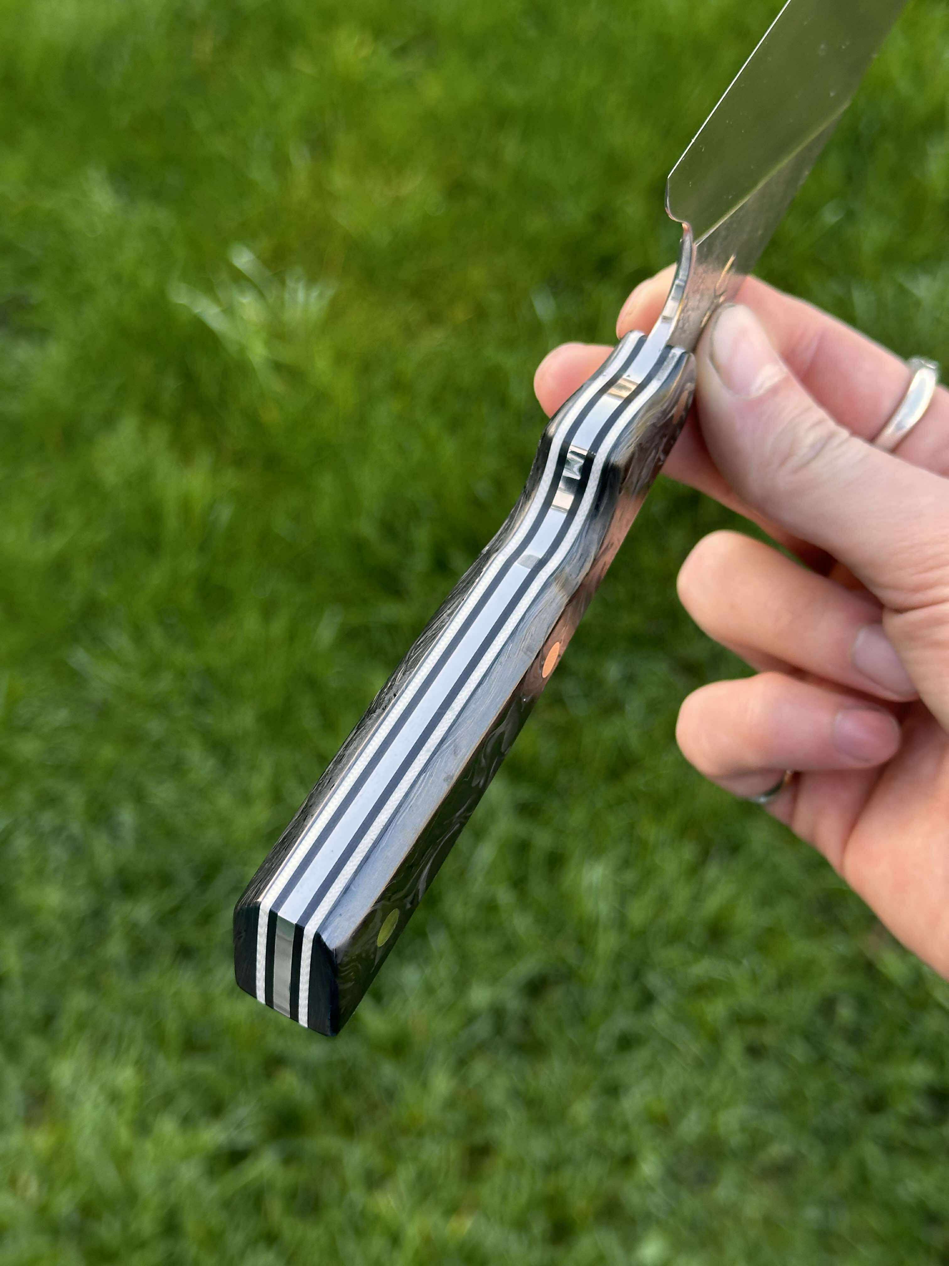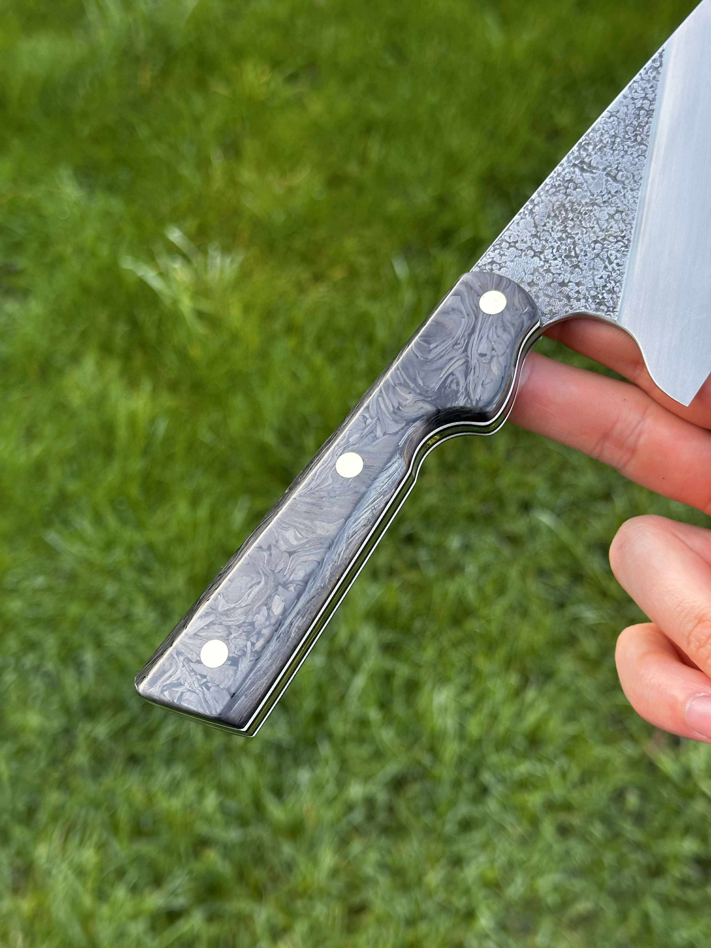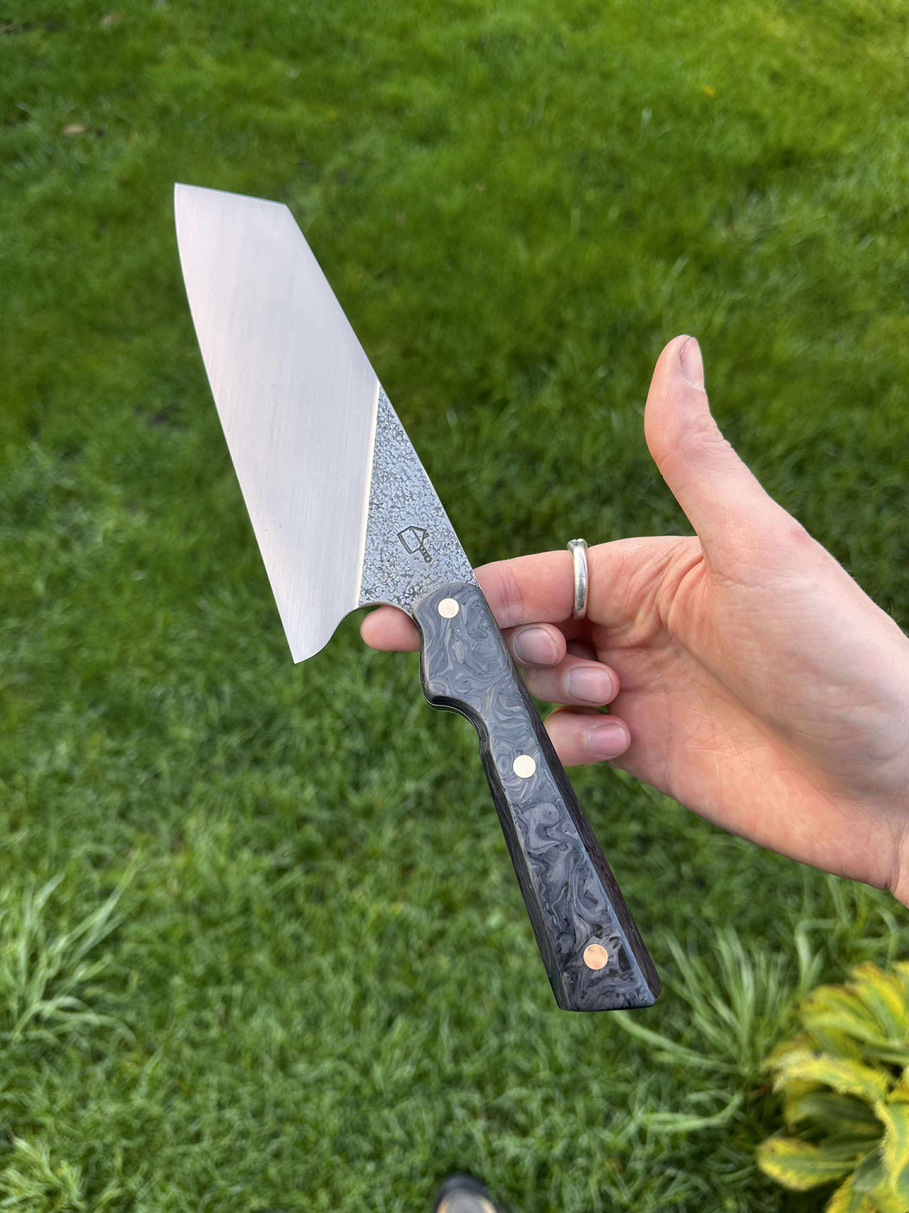 BY FAR MY MOST POPULAR STYLE AND WITHIN REASON. A general purpose kitchen knife, traditional style blade meets a more funky style handle. This knife is intended as your go to, do it all knife (within reason). For further info check out the 'Knives' section of the website. BY PURCHASING THIS YOU ARE CONFIRMING THAT YOU ARE OVER THE AGE OF 18