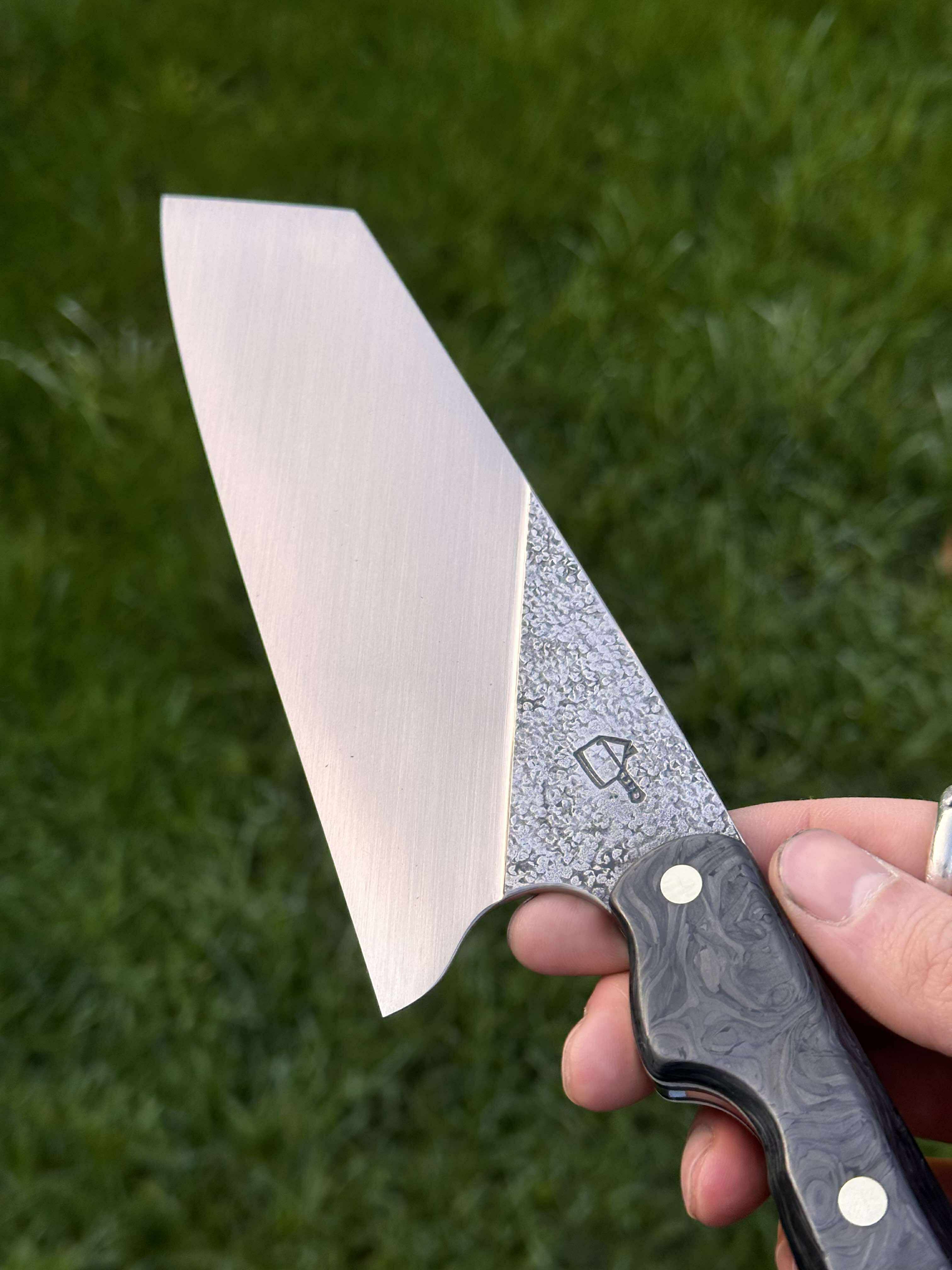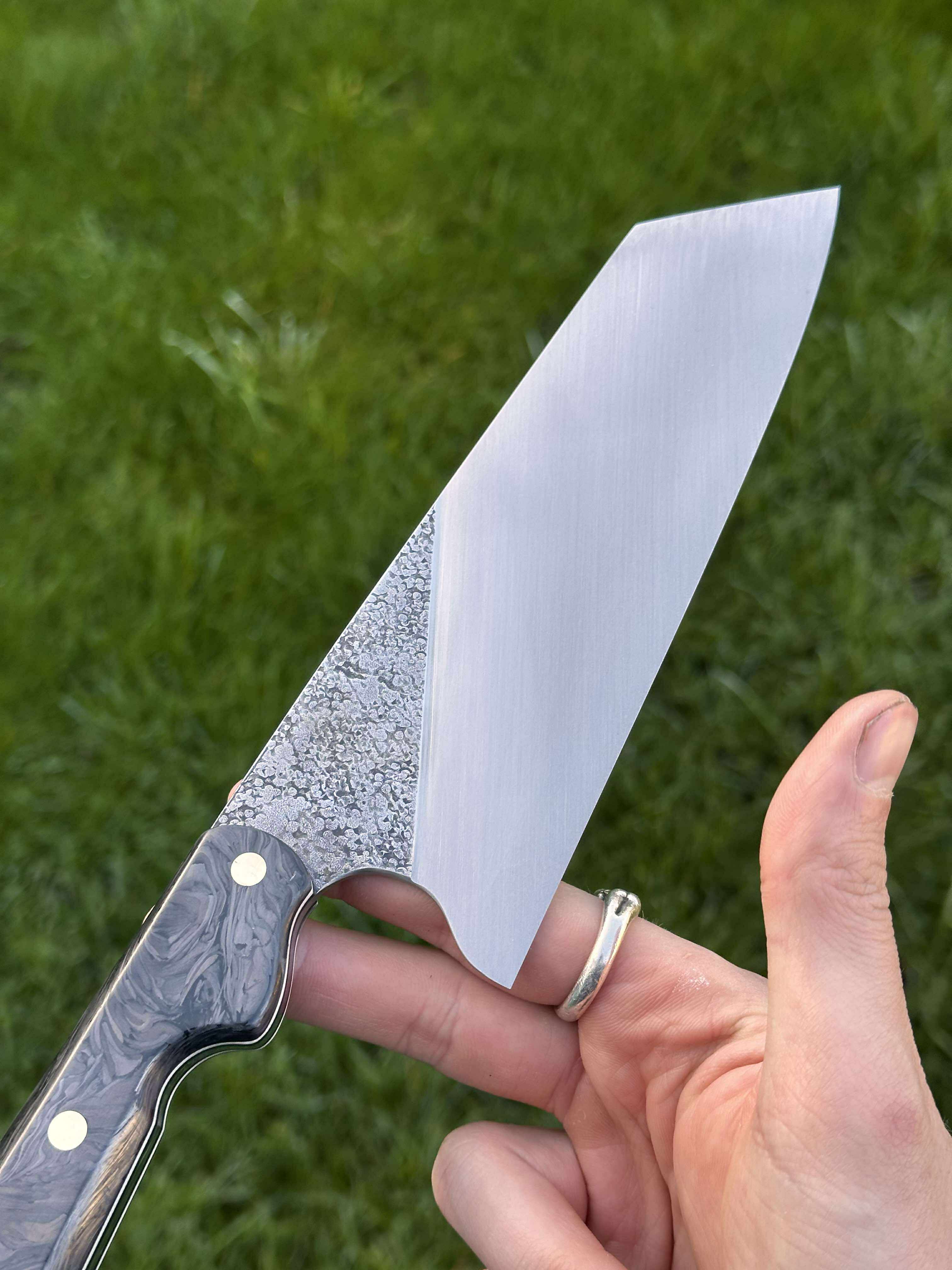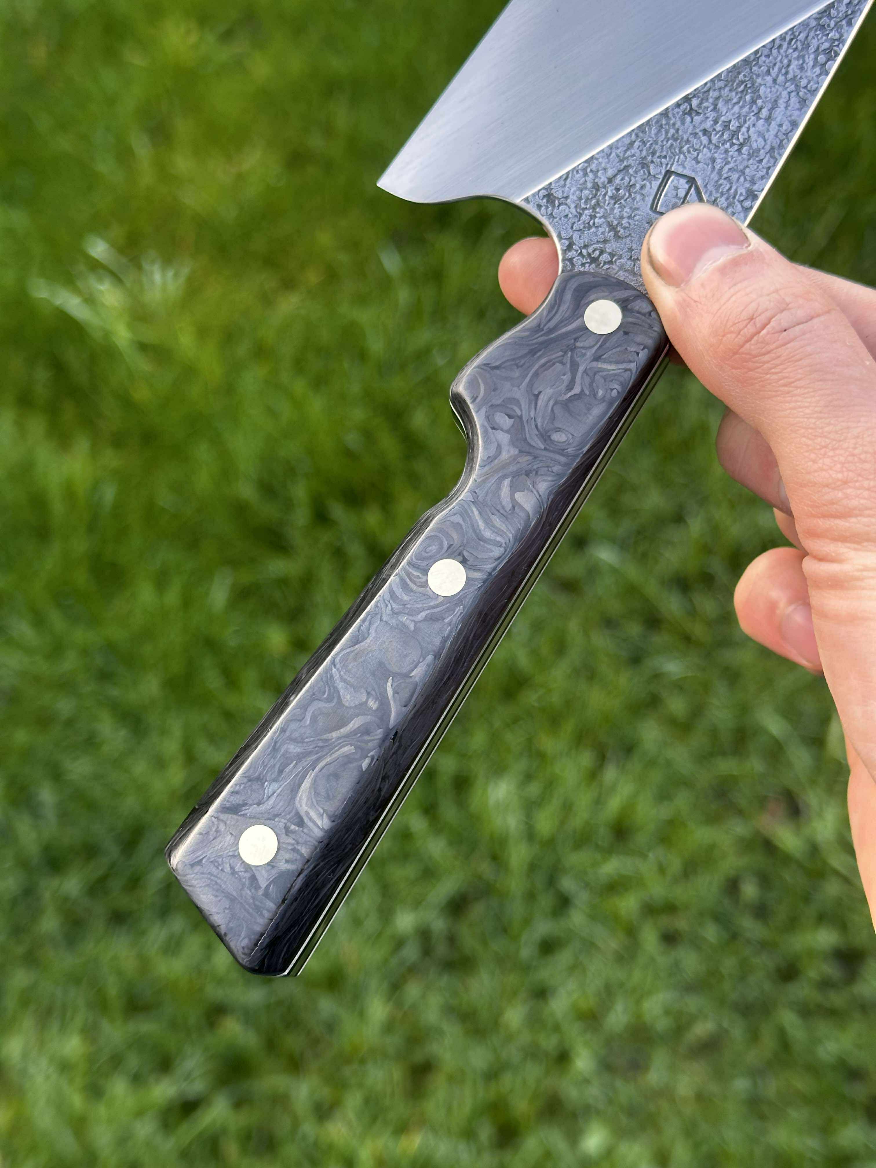 BY FAR MY MOST POPULAR STYLE AND WITHIN REASON. A general purpose kitchen knife, traditional style blade meets a more funky style handle. This knife is intended as your go to, do it all knife (within reason). For further info check out the 'Knives' section of the website. BY PURCHASING THIS YOU ARE CONFIRMING THAT YOU ARE OVER THE AGE OF 18